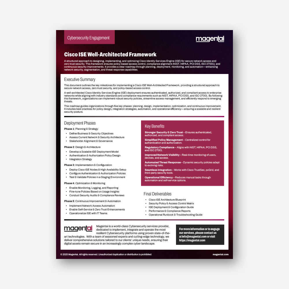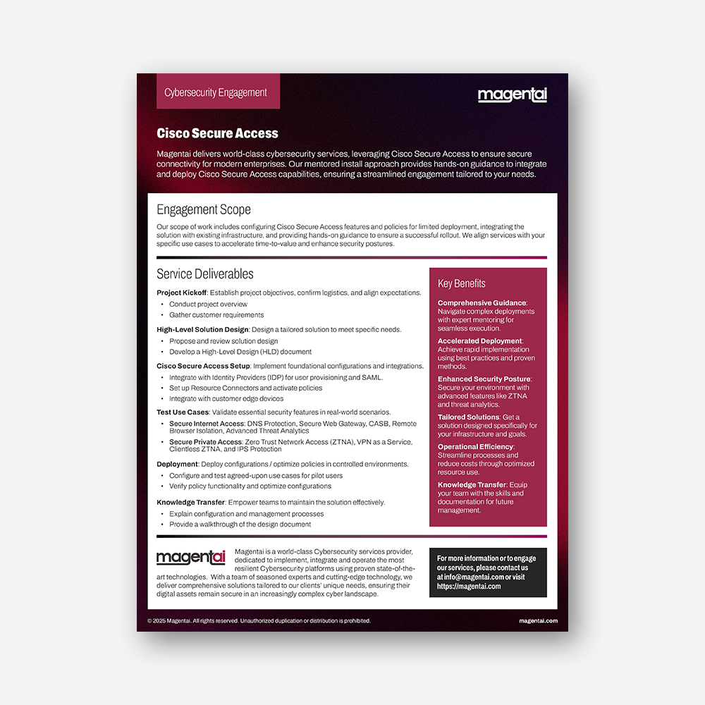 Magentai delivers world-class cybersecurity services, leveraging Cisco Secure Access to ensure secure connectivity for modern enterprises. Our mentored install approach provides hands-on guidance to integrate and deploy Cisco Secure Access capabilities, ensuring a streamlined engagement tailored to your needs.