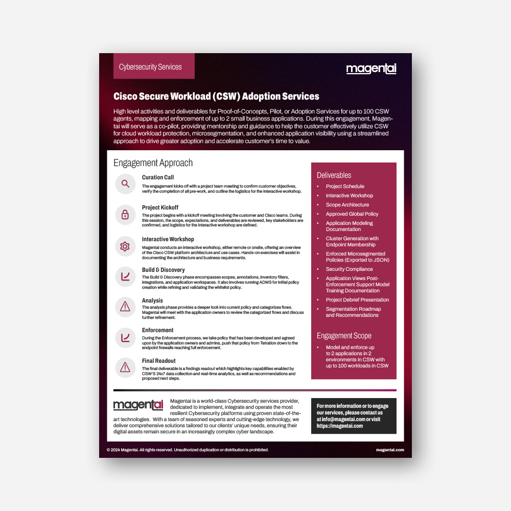 High level activities and deliverables for Proof-of-Concepts, Pilot, or Adoption Services for up to 100 CSW agents, mapping and enforcement of up to 2 small business applications. During this engagement, Magentai will serve as a co-pilot, providing mentorship and guidance to help the customer effectively utilize CSW for cloud workload protection, microsegmentation, and enhanced application visibility using a streamlined approach to drive greater adoption and accelerate customer’s time to value.