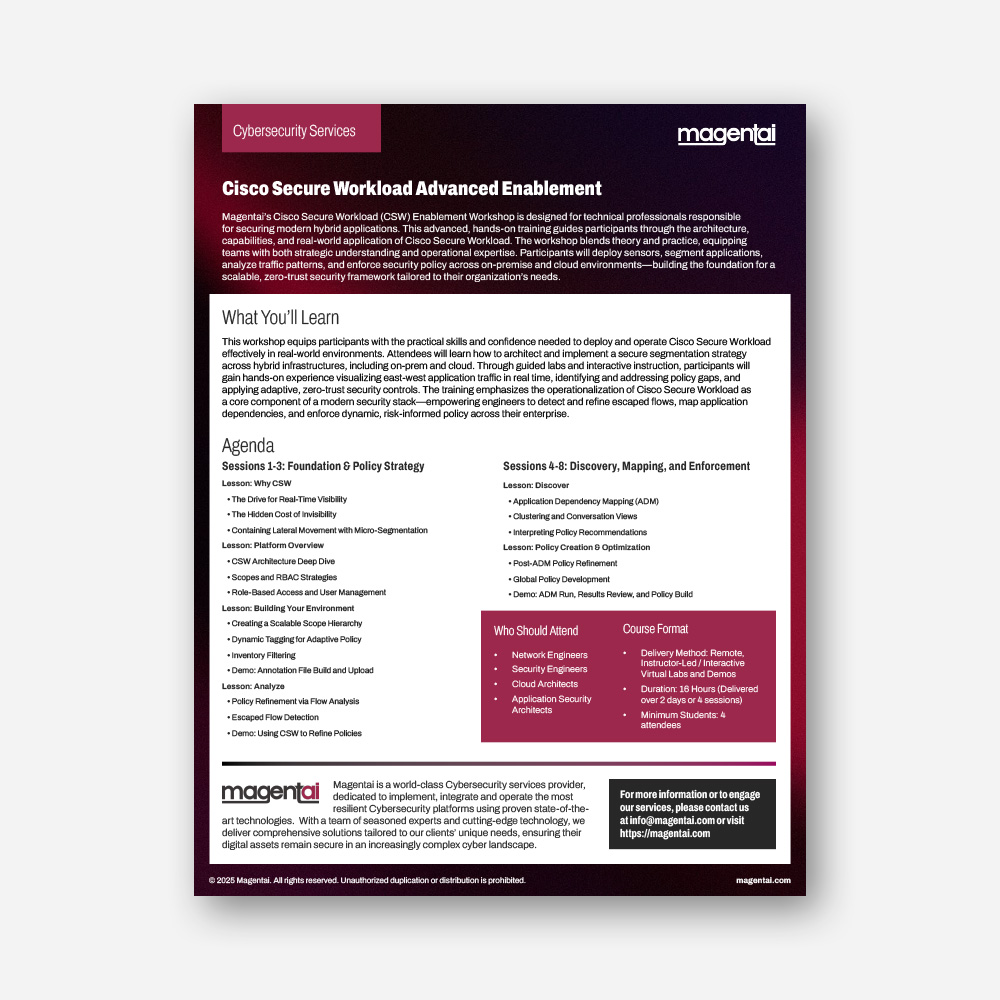 Magentai’s Cisco Secure Workload (CSW) Enablement Workshop is designed for technical professionals responsible for securing modern hybrid applications. This advanced, hands-on training guides participants through the architecture, capabilities, and real-world application of Cisco Secure Workload. The workshop blends theory and practice, equipping teams with both strategic understanding and operational expertise. Participants will deploy sensors, segment applications, analyze traffic patterns, and enforce security policy across on-premise and cloud environments—building the foundation for a scalable, zero-trust security framework tailored to their organization’s needs.