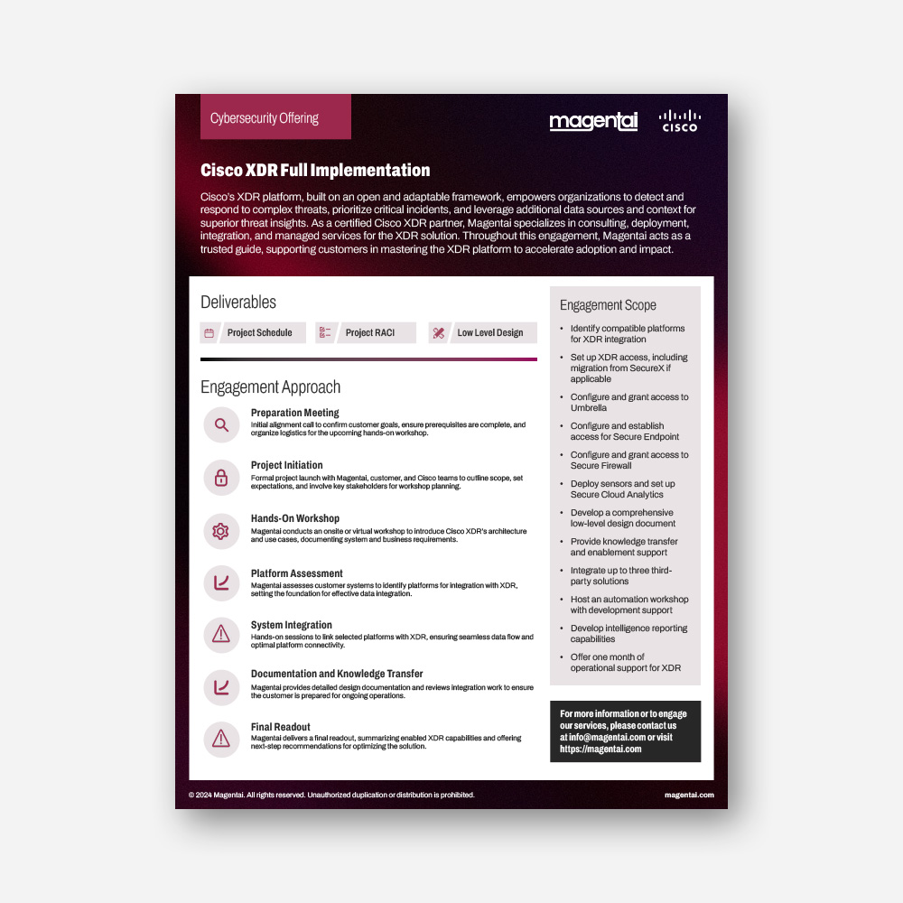 Cisco’s XDR platform, built on an open and adaptable framework, empowers organizations to detect and respond to complex threats, prioritize critical incidents, and leverage additional data sources and context for superior threat insights. As a certified Cisco XDR partner, Magentai specializes in consulting, deployment, integration, and managed services for the XDR solution. Throughout this engagement, Magentai acts as a trusted guide, supporting customers in mastering the XDR platform to accelerate adoption and impact.