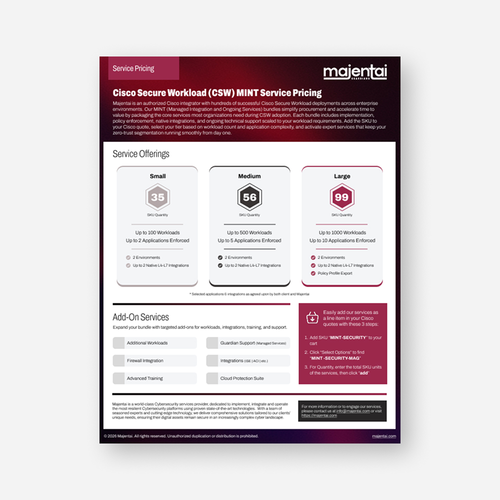 Majentai is an authorized Cisco integrator with hundreds of successful Cisco Secure Workload deployments across enterprise environments. Our MINT (Managed Integration and Ongoing Services) bundles simplify procurement and accelerate time to value by packaging the core services most organizations need during CSW adoption. Each bundle includes implementation, policy enforcement, native integrations, and ongoing technical support scaled to your workload requirements. Add the SKU to your Cisco quote, select your tier based on workload count and application complexity, and activate expert services that keep your zero-trust segmentation running smoothly from day one.
