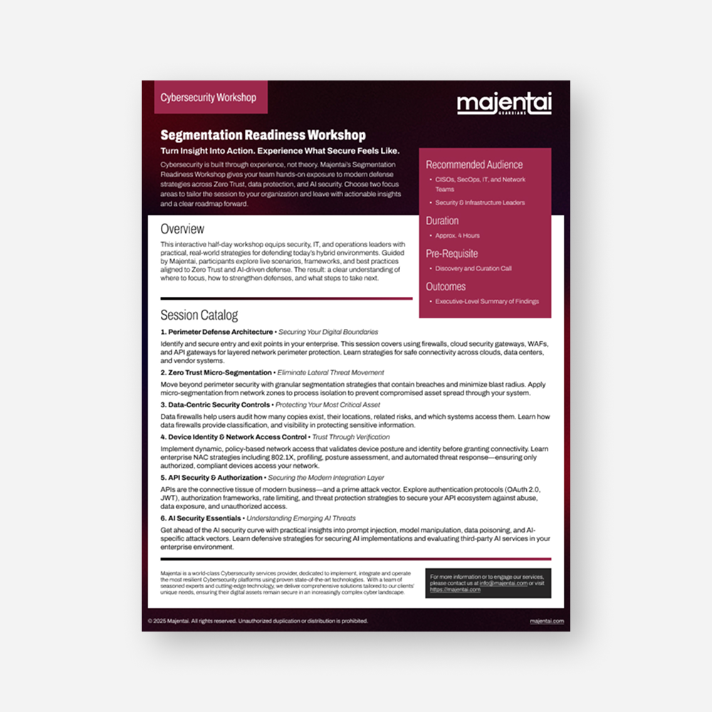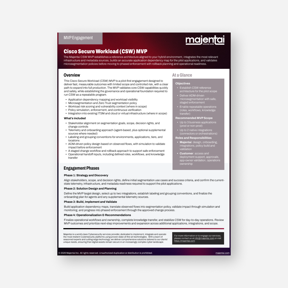 The Majentai CSW MVP establishes a reference architecture aligned to your hybrid environment, integrates the most relevant infrastructure and metadata sources, builds an accurate application dependency map for the pilot applications, and validates microsegmentation policies before moving to phased enforcement with rollback planning and operational readiness.