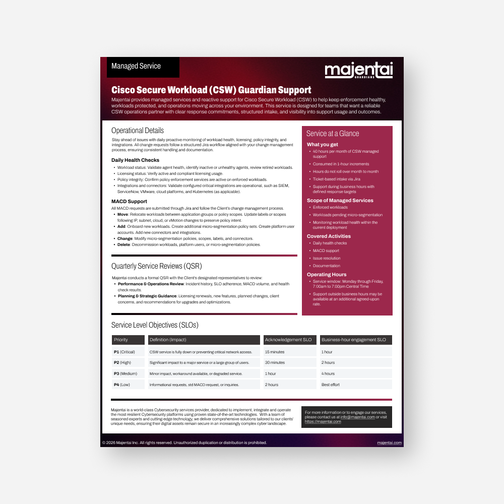 Majentai provides managed services and on-demand support for Cisco Secure Workload (CSW), with daily monitoring and clear-response support to keep enforcement healthy and operations running.