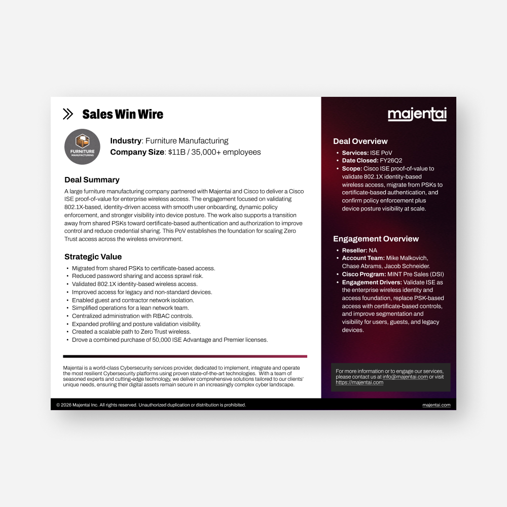 A large furniture manufacturing company partnered with Majentai and Cisco to deliver a Cisco ISE proof-of-value for enterprise wireless access. The engagement focused on validating 802.1X-based, identity-driven access with smooth user onboarding, dynamic policy enforcement, and stronger visibility into device posture. The work also supports a transition away from shared PSKs toward certificate-based authentication and authorization to improve control and reduce credential sharing. This PoV establishes the foundation for scaling Zero Trust access across the wireless environment.